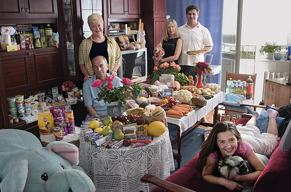 Le soir, à table, on se demande parfois « que va t-on manger au Botswana, au Vietnam, au Pérou et combien ça va coûter ? ». Le photographe Peter Menzel nous donne la réponse. En 2005, il a photographié une trentaine de familles du monde qui posent devant la nourriture qu’elles consomment en moyenne chaque semaine.