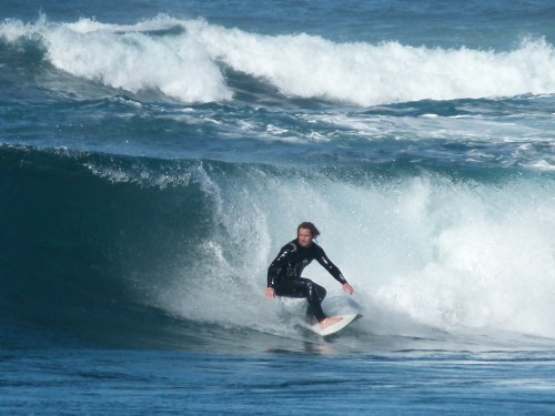 Je cherche un bon endroit pour faire des photos de vagues. Je m’adosse au mur de la promenade qui longe le bord des rochers, près d’un gars dont un avant-bras est plâtré. Il est justement en train de photographier les surfeurs. Il engage la conversation. D’où tu viens, que fais-tu etc … Il m’explique qu’il est surfeur, vend des planches de surf, fait de la photographie de surfeurs. Bon, le surf c’est son truc. La semaine dernière, Il s’est cassé le bras sur les rochers qui affleurent en surfant précisément dans la zone qui nous fait face. Comme tous les gens rencontrés depuis le départ, ce mec est très sympa. Je garde à l’esprit que les filles envisagent vaguement de se baigner et j’en profite pour lui demander s’il connait la température de l’eau. Voici sa réponse : “guy, surfers don’t speak about degrees. We just know three temperatures : warm, cold and fucking cold. Today is fucking cold”.
