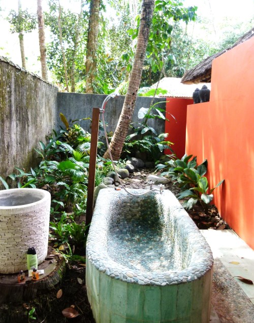 La salle de bain et la cuisine sont à l’extérieur : on prend donc sa douche sous les palmiers et on cuisine dans le jardin.