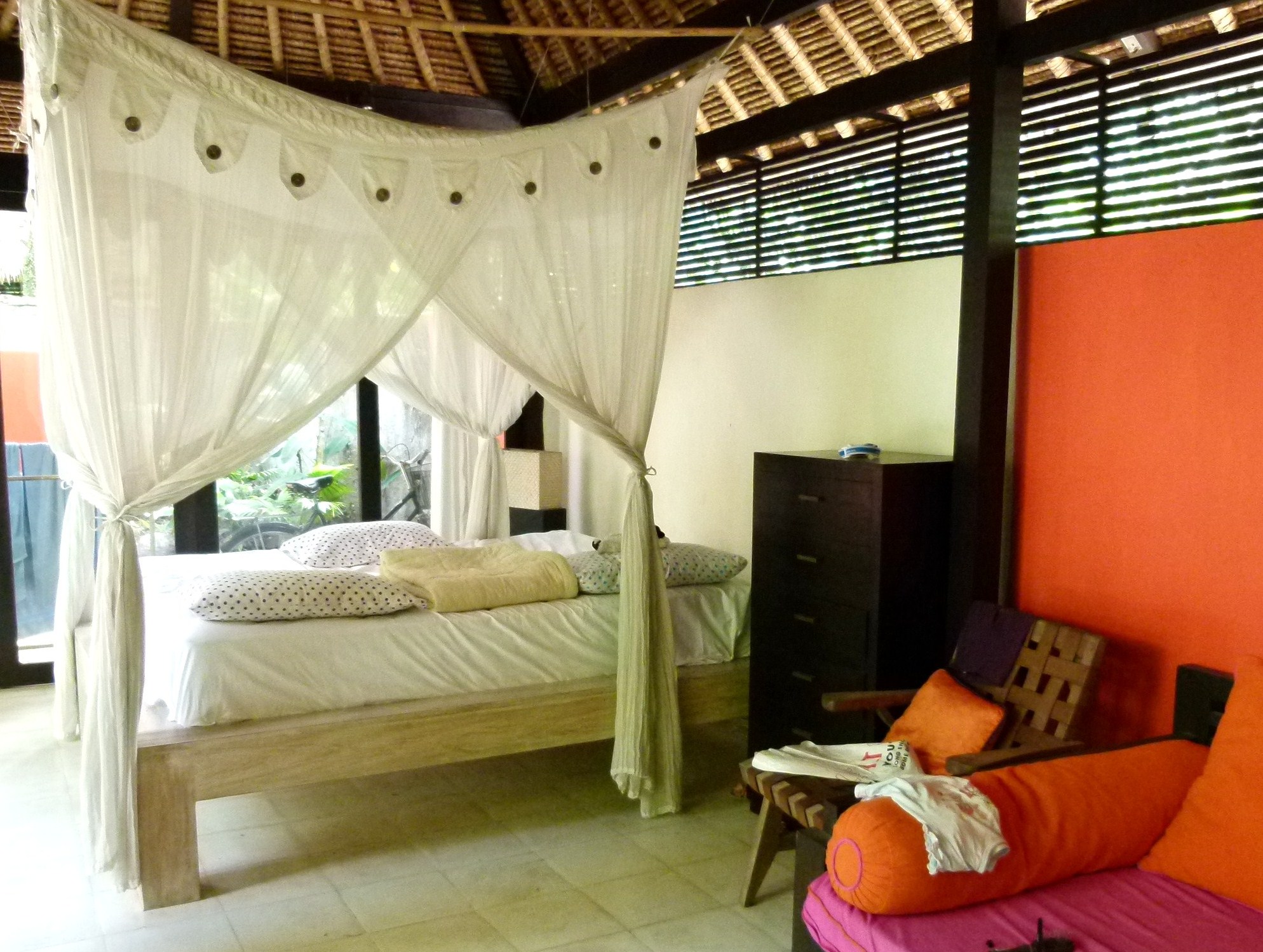 La maison est superbe et semble conçue pour être parfaitement en harmonie avec la nature : le toit de paille est posé sur des piliers en bois, mais laisse un grand espace avec les murs et notre chambre n’a carrément pas de cloison ! Seuls des rideaux nous isolent de l’extérieur.