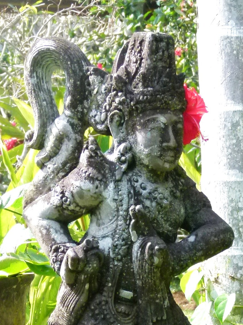 Des fleurs de tiaré et d’hibiscus dans les cheveux et sur les lits, des parfums d’encens, des petites offrandes posées sur le sol, des statues de Ganesh en pierre, des habitations qui mélangent bois et jungle de verdure, voilà les images de notre vie.