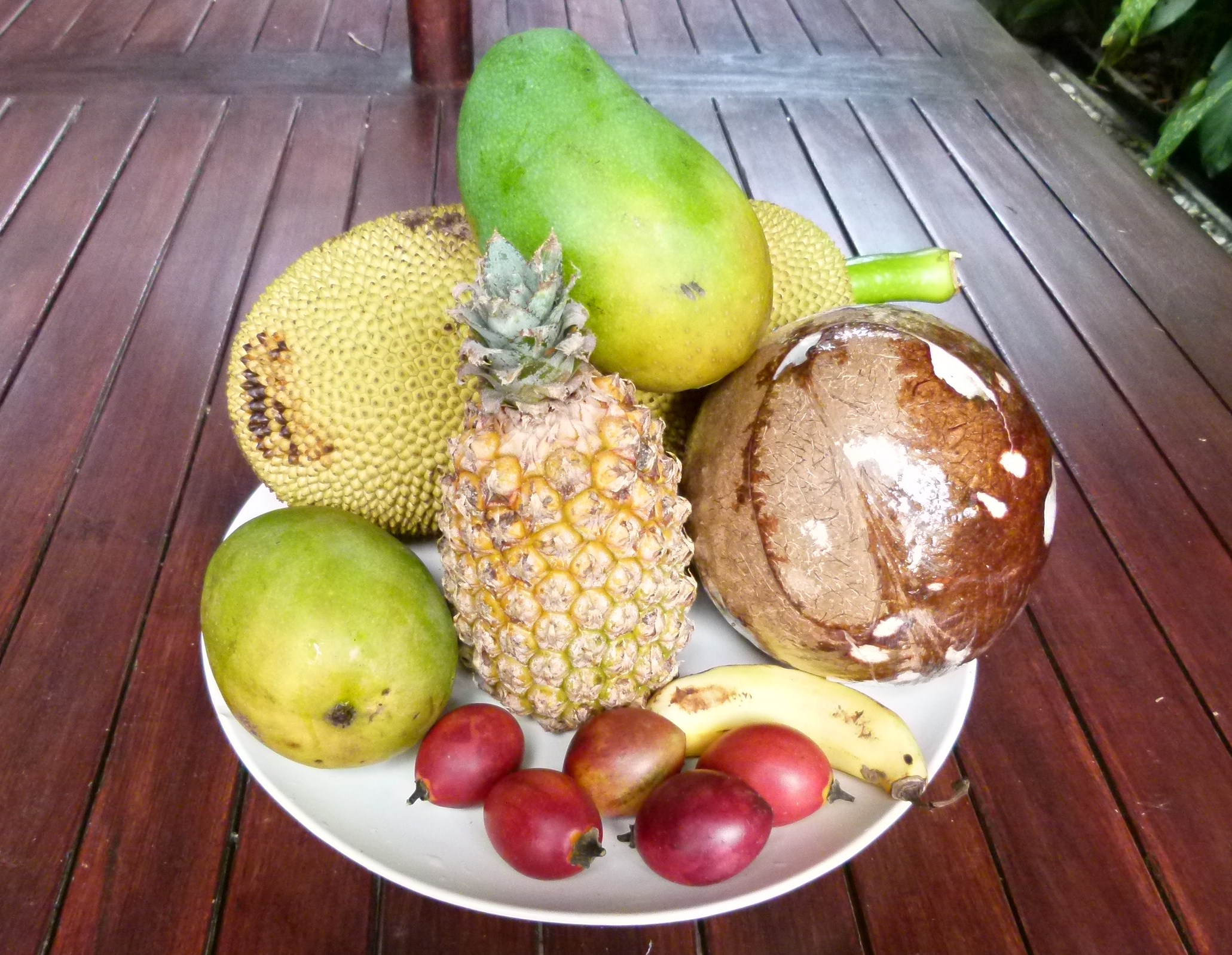 C : il y a le durian qui est dégueu. Les mangoustines, je n’ai pas gouté. Les fruits de la passion sont excellents et le fruit du Dragon n’a pas trop de goût. On a trouvé un jaque fruit lors d’une balade, mais il n’était pas mûr.