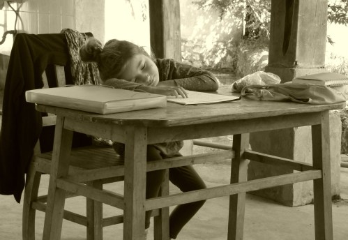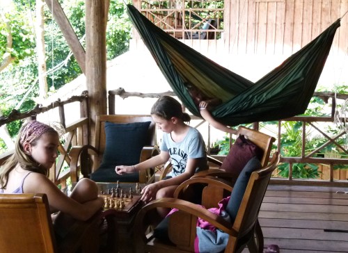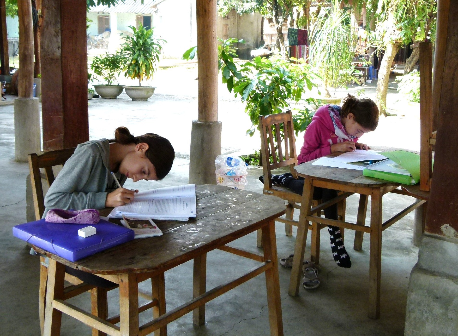 L’inconvénient ? Il y a du boulot … Nos deux filles aînées sont inscrites en 6ème et 5ème avec donc sensiblement la même charge de travail. Au début, on a essayé de tenir un emploi du temps. Ca a marché une semaine. Depuis, les filles travaillent quasiment tous les jours, environ deux ou trois heures par jour, 7 jours sur 7. Quand il y a une journée sans école (comme une journée de transport par exemple), il faut rattraper. Pas de week-ends et (presque) pas de vacances. L’avancée du travail est en fait déterminée par le calendrier de renvoi des devoirs du CNED. Parfois, à quinze jours de la date, elle mettent les bouchées double et nous suivons de près l’avancement des séances. Elles travaillent sur un support papier condensé ou plus rarement sur l’écran de l’ordinateur. Les conditions sont souvent « spéciales » : à la terrasse d’un café, dans un hall d’aéroport, avec le bruit des vagues, celui de l’appel à la prière du muezzin, à la lumière d’une lampe frontale si l’électricité est coupée … Mais leur capacité de concentration reste globalement très bonne. Elles se sont bien adaptées les petites …