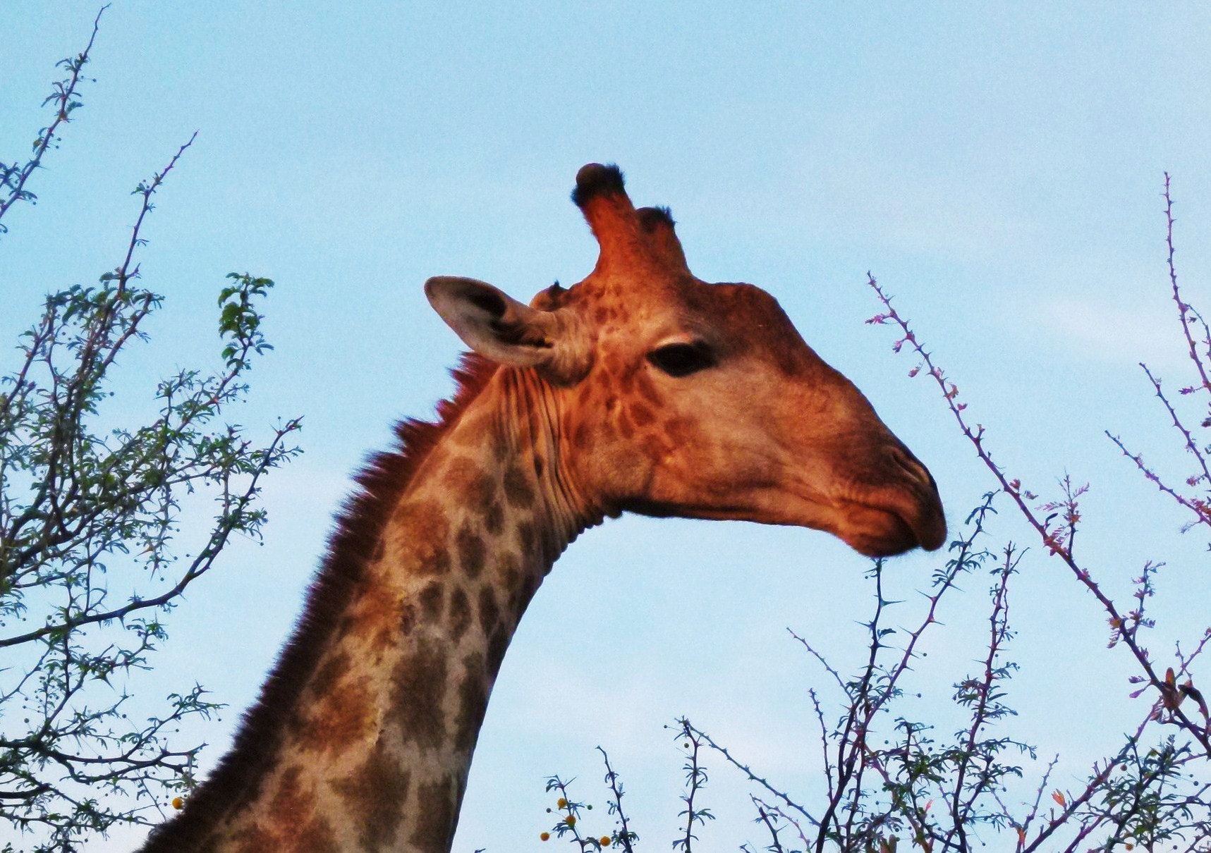 M : « C’est une girafe, elle était haute avec de grosses tâches et des cornes sur la tête qui ressemblaient à des petits poteaux. C’était juste avant d’entrer dans le parc de Moremi. »