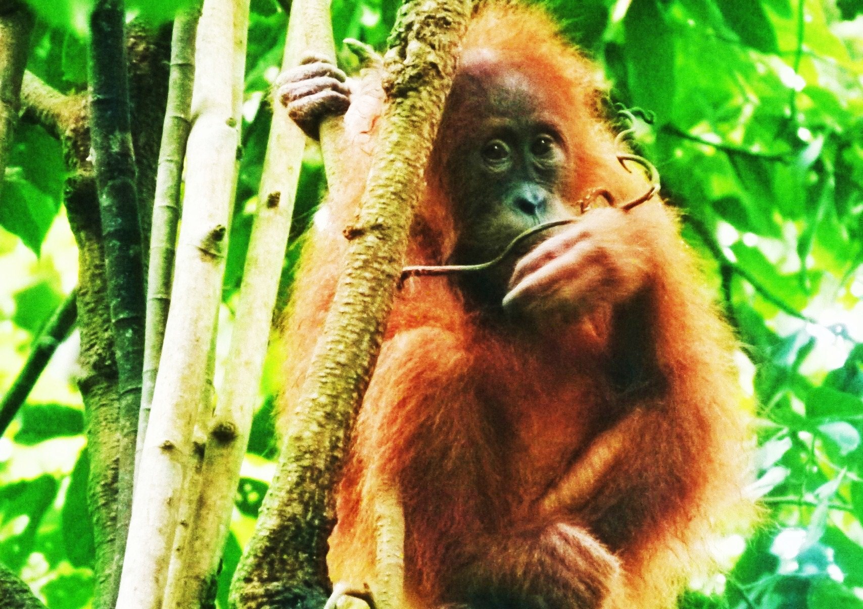 M : « C’est un orang-outan qu’on a vu dans la jungle à Bukit Lawang. Il y en a un qui venait prendre les morceaux de banane qui étaient accrochés sur un tronc d’arbre. »