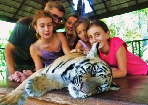 M : « Ah oui je me souviens, ici on pouvait caresser des bébés tigres, je crois que c’était à Bali. »  NDLR : en fait c’est près de Chiang Maï, en Thaïlande.