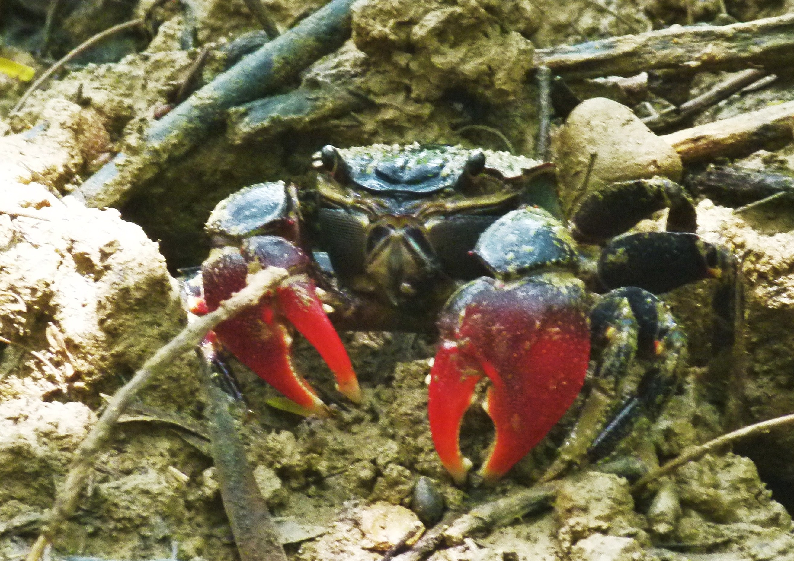 L : « Voici un crabe aux pinces rouges dans le jardin du centre culturel près de Nouméa en Nouvelle-Calédonie. »