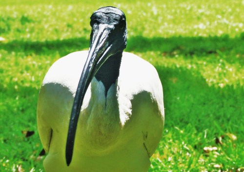 L : « Voici un ibis. Ce n’est pas hôtel mais un oiseau. Il se promène dans un parc à Sydney. Pendant ce temps, nous pique-niquons avec la « belle parenthèse » (les Fouet, une famille de français tourdumondiste) et nous jetons des chips aux ibis.