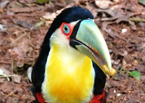 L : « Dans le parc aux oiseaux de Foz de Iguaçu (Brésil), un toucan attrape un gâteau salé qui traîne par-terre … »