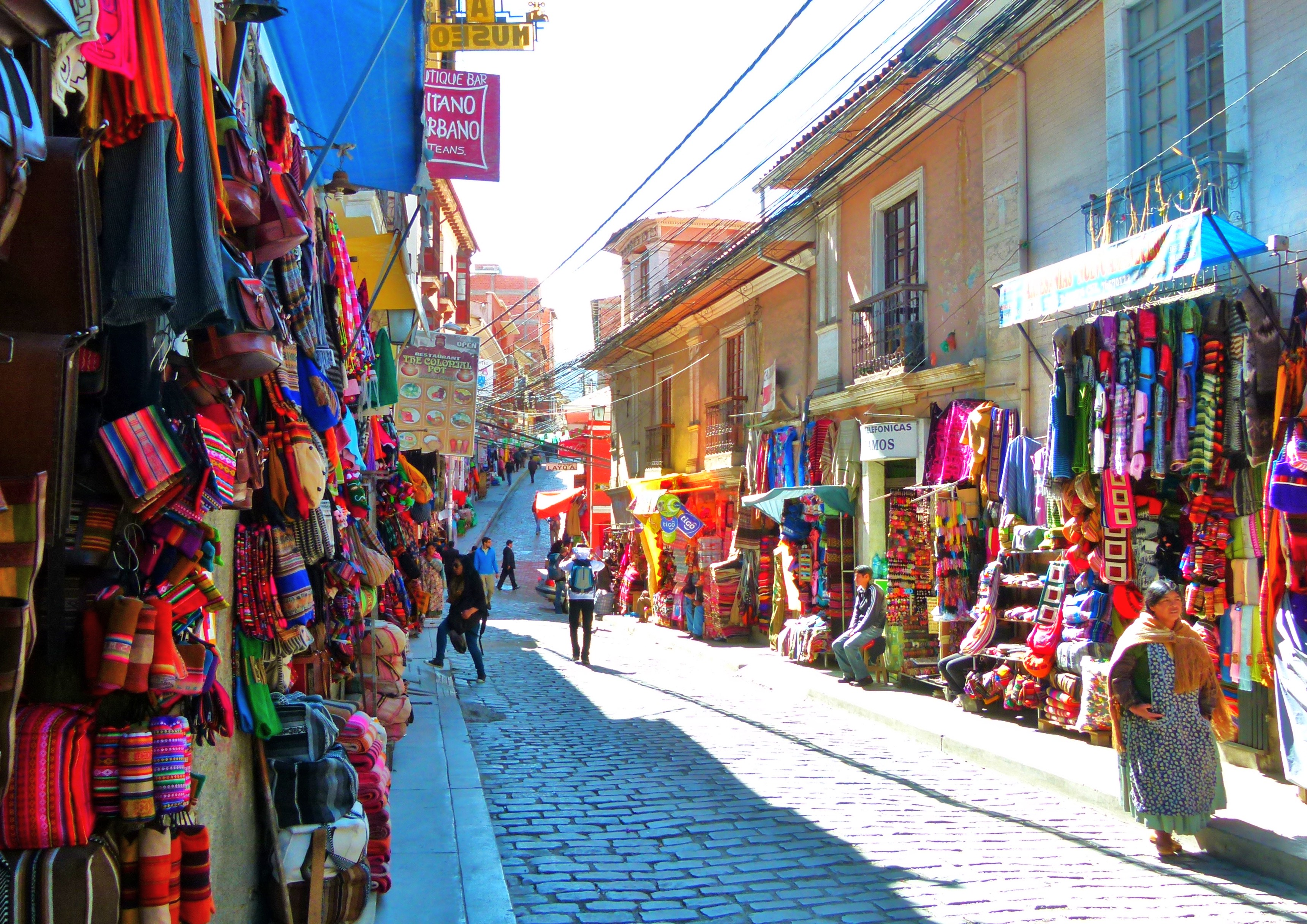 Les ruelles pour touristes offrent un éventail très coloré de l’artisanat du pays : pulls en Alpaga, trousses, sacs, flûtes, appelées ici quenas, chaussettes et autres bonnets.
