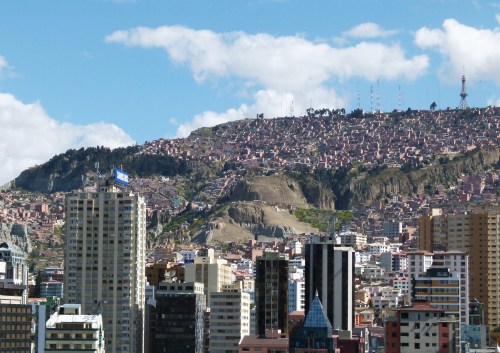 Enfin, nous voilà à La Paz, capitale administrative de la Bolivie. Cette ville présente une physionomie très particulière : elle s’étend d’El Alto, immense zone d’habitats précaires en altitude, encore sur l’Altiplano (4000 m), au fond d’un canyon profond de 400m. L’ensemble des parois du canyon est recouvert de petites bâtisses en briques rouges qui abritent la population grandissante des immigrants de La Paz.