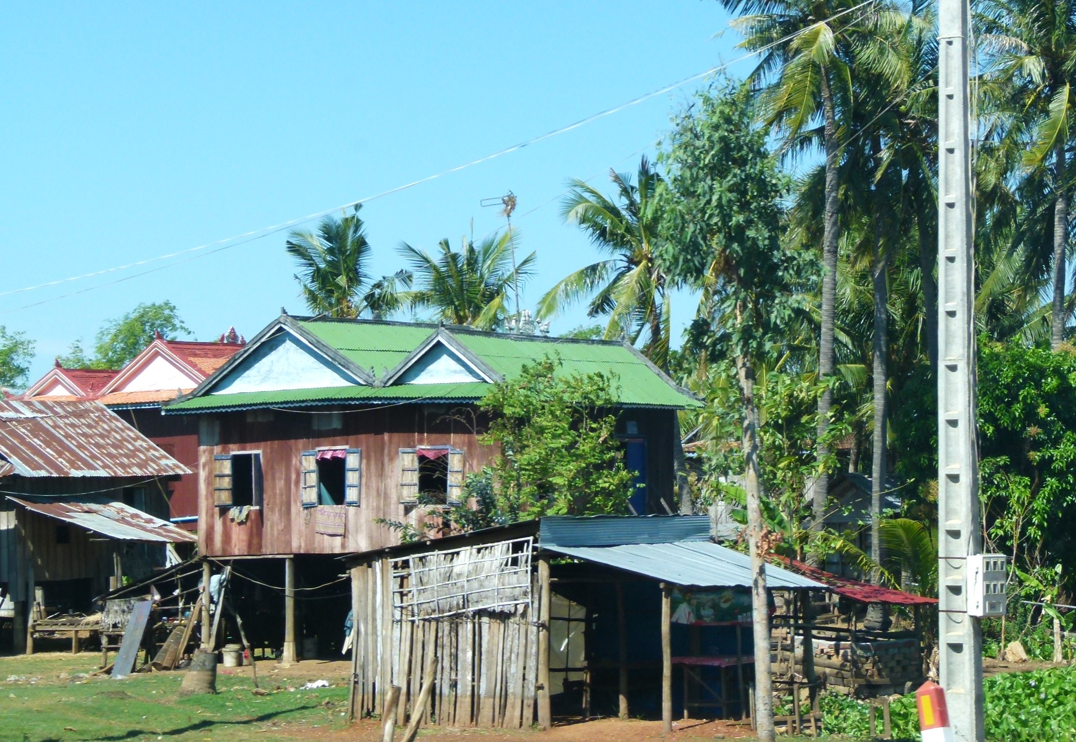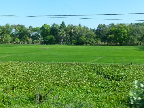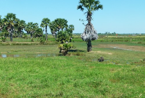 Les paysages du centre du Cambodge, ce sont des rizières marrons ou vertes (selon qu’elles sont inondées ou pas), séparées par des haies d’arbres tropicaux.