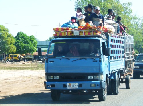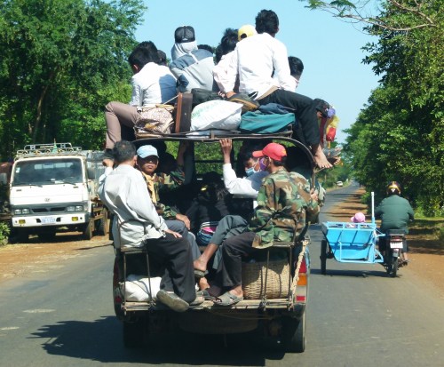 Pour conduire les paysans dans les rizières, des voitures transportent une bonne quinzaine de passagers. Dans ce genre de convoi, le conducteur partage son siège avec une autre personne.