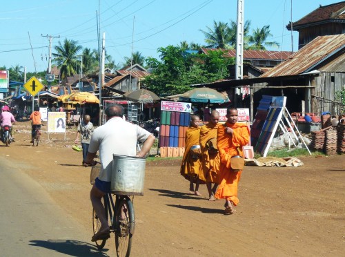 Comme au Laos, les moines en robe safran marchent le long des routes et vont mendier leur nourriture.