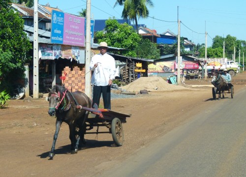 La campagne, ça commence dans Phnom Penh même, avec cette charrette qui passe devant notre terrasse au moment du petit déjeuner. Regardez comme les bœufs sont sveltes.