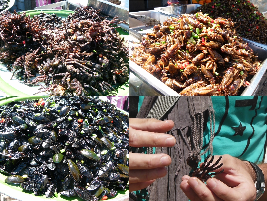 Les pattes des mygales ont un petit goût de crustacés. C’est très croustillant. La tête et le corps craquent bien sous la dent. Un français qui en mange en même temps que moi et qui semble s’y connaître en viande, dit que le corps de l’araignée lui rappelle un goût de foie de volaille !