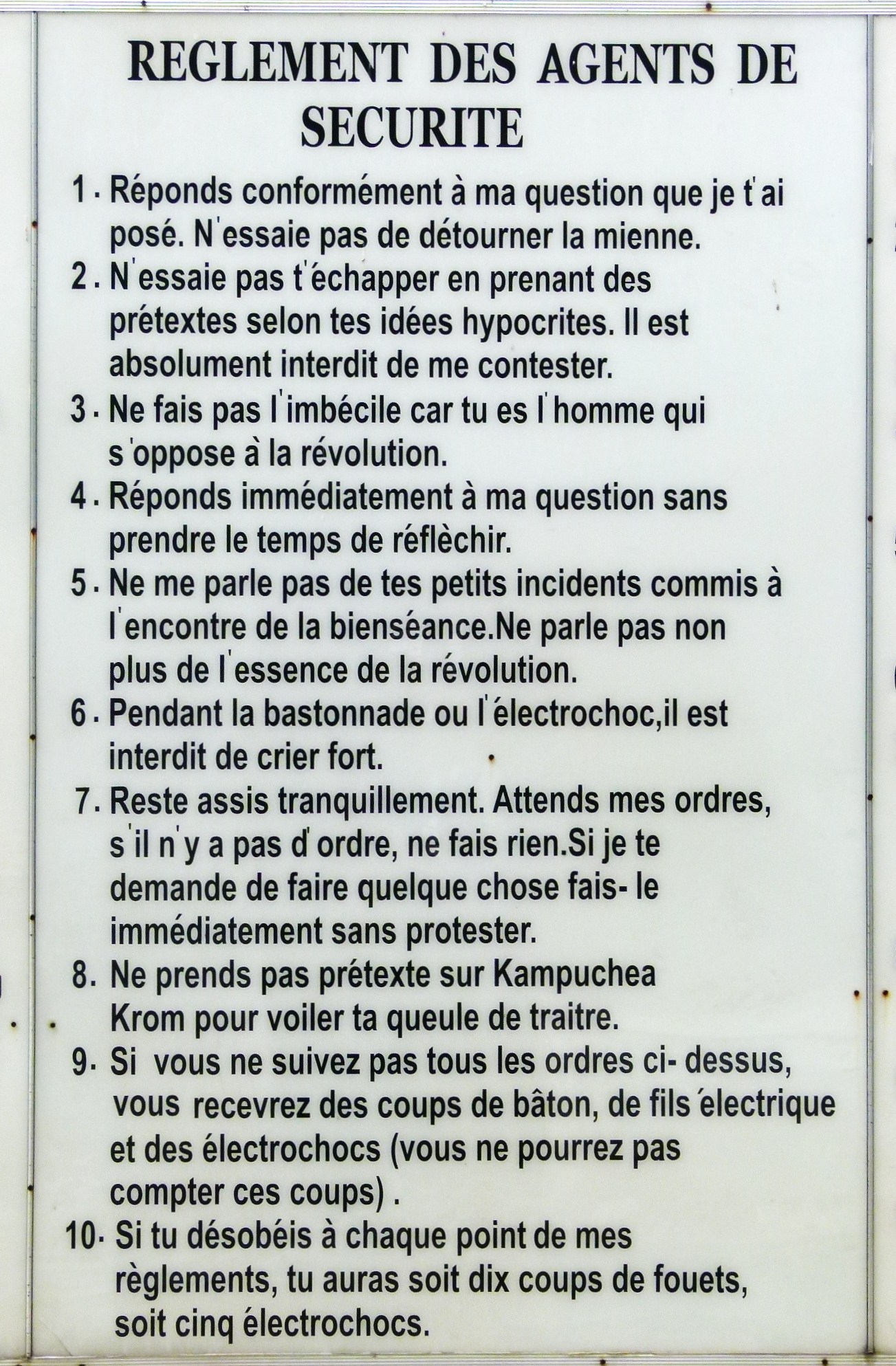 – Sans les enfants, nous nous rendons à Tuol Sieng, musée du Crime du Génocide, qui fut la prison la plus terrifiante sous la domination des Khmers Rouges. Les images se passent de commentaires. Voici un extrait du règlement de la prison, ainsi que l’un des nombreux panneaux affichant le visage des prisonniers dont seuls quelques-uns ressortiront vivants.