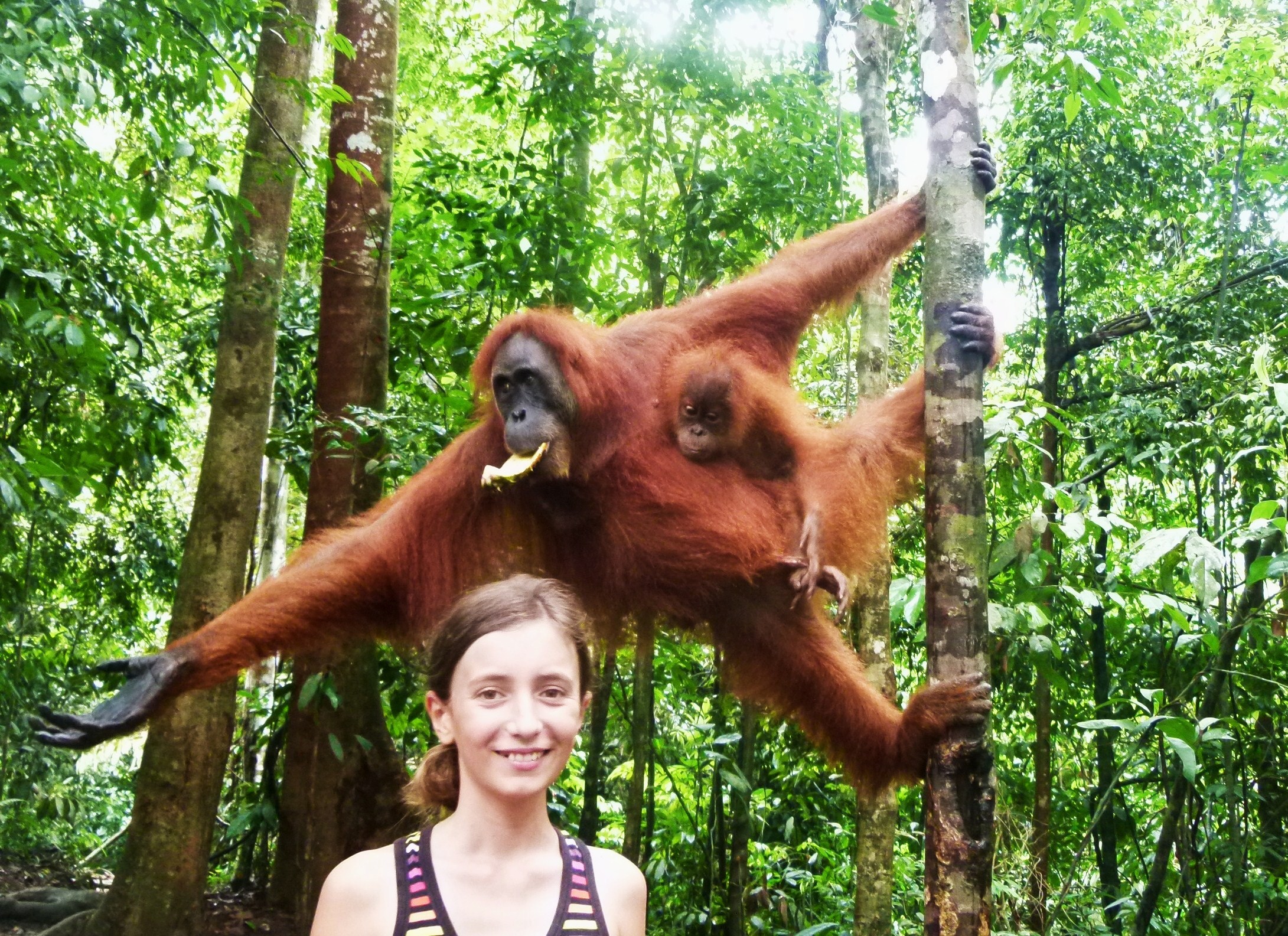 On continue à marcher et Mady en a marre d’entendre les bruits de la jungle faits par des petits animaux (des criquets). Alex lui dit alors : « Viens voir des gros animaux». A ce moment là, nous arrivons dans une clairière. Suspendue à un arbre, une femelle Orangs-Outans de 17 ans et de 40 kg environ est en train de manger des rondelles de bananes que le guide a accroché en bas du tronc pour l’attirer. Il y a aussi son bébé à quelques mètres dans un autre arbre, c’est génial ! … Mais dès que le bébé s’approche pour rejoindre sa mère, elle s’éloigne (on ne sait pas trop pourquoi).
