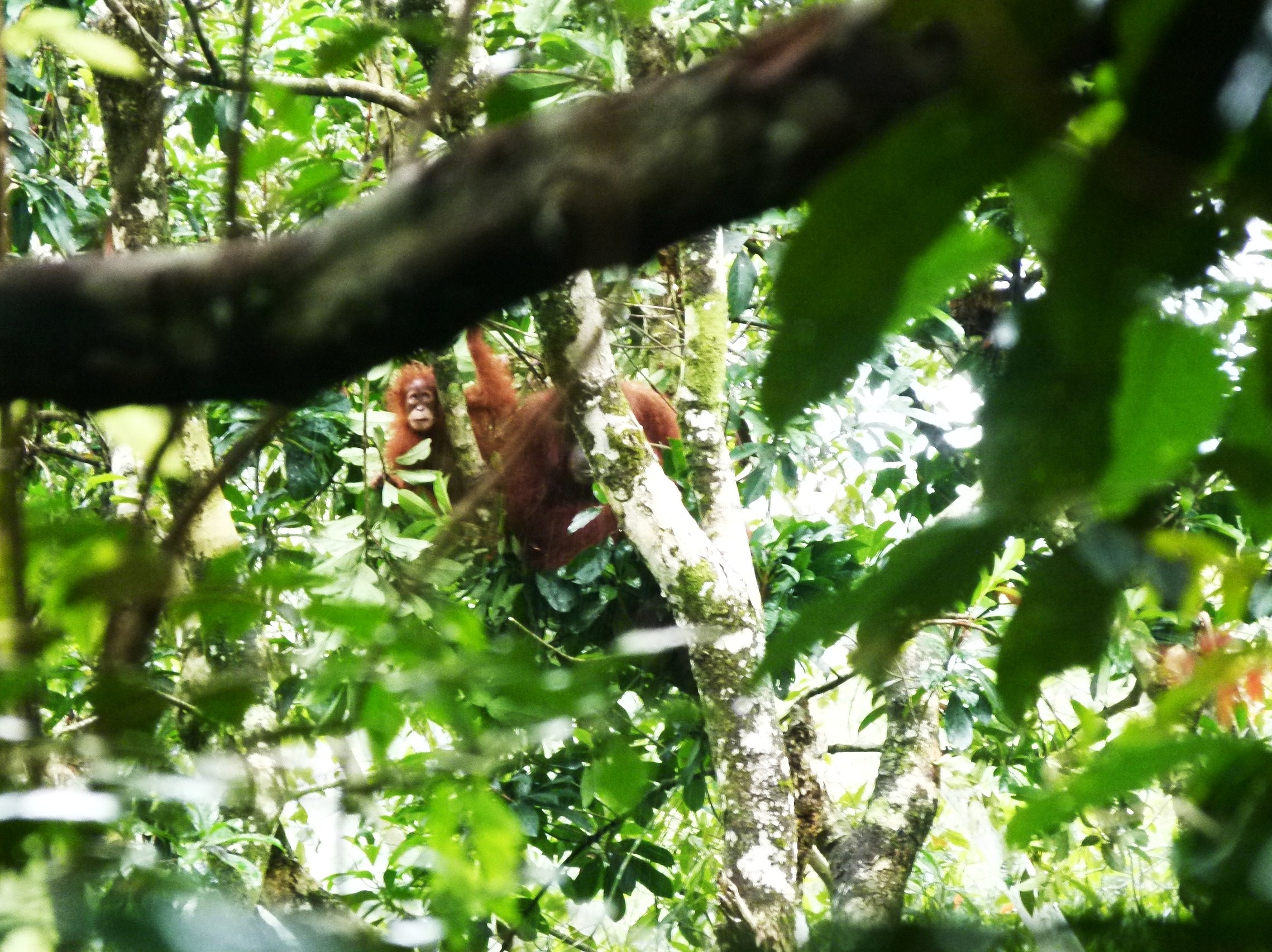 On aperçoit quand même les Orangs-Outans de loin : une femelle et son bébé.
