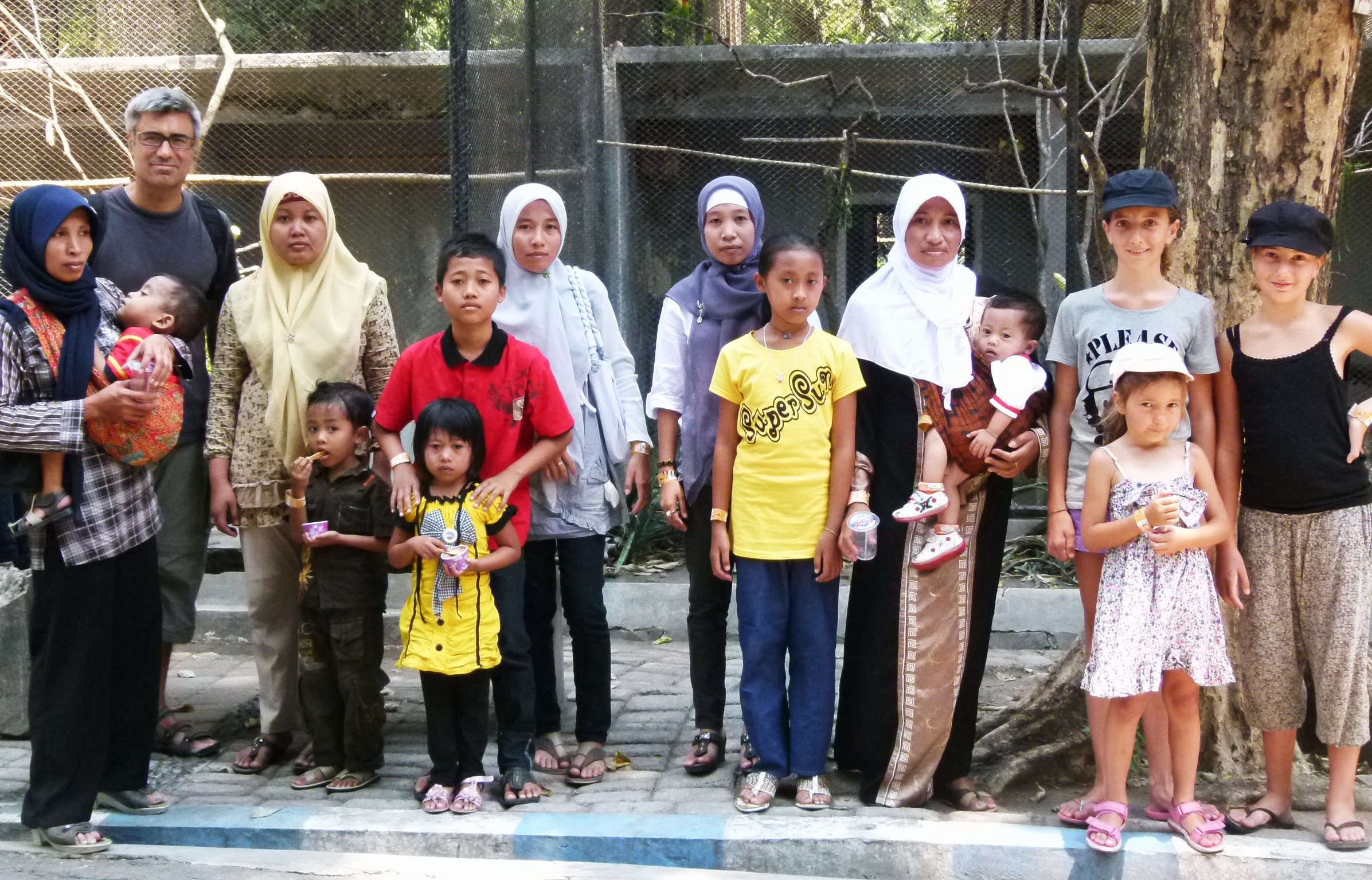 Une constante dans nos visites et sorties diverses depuis que nous sommes en Indonésie et encore plus depuis Java : Mady attire systématiquement la sympathie des gens que nous croisons : ils adorent ses joues et lui pincent à chaque fois : elle craque !!! D’autre part, nous avons aussi souvent l’impression d’être des bêtes de foire car les locaux nous sollicitent beaucoup pour nous prendre en photos avec leur famille. A croire qu’ils ne voient pas beaucoup d’occidentaux par ici, et pourtant, des touristes, il y en a !! Les filles ont joué le jeu un temps. Maintenant, elles refusent et partent se cacher pour éviter la séance photos : il ne reste que nous, mais moi, ça me fait bien rire de poser en débardeur et short à côté des mamies voilées !