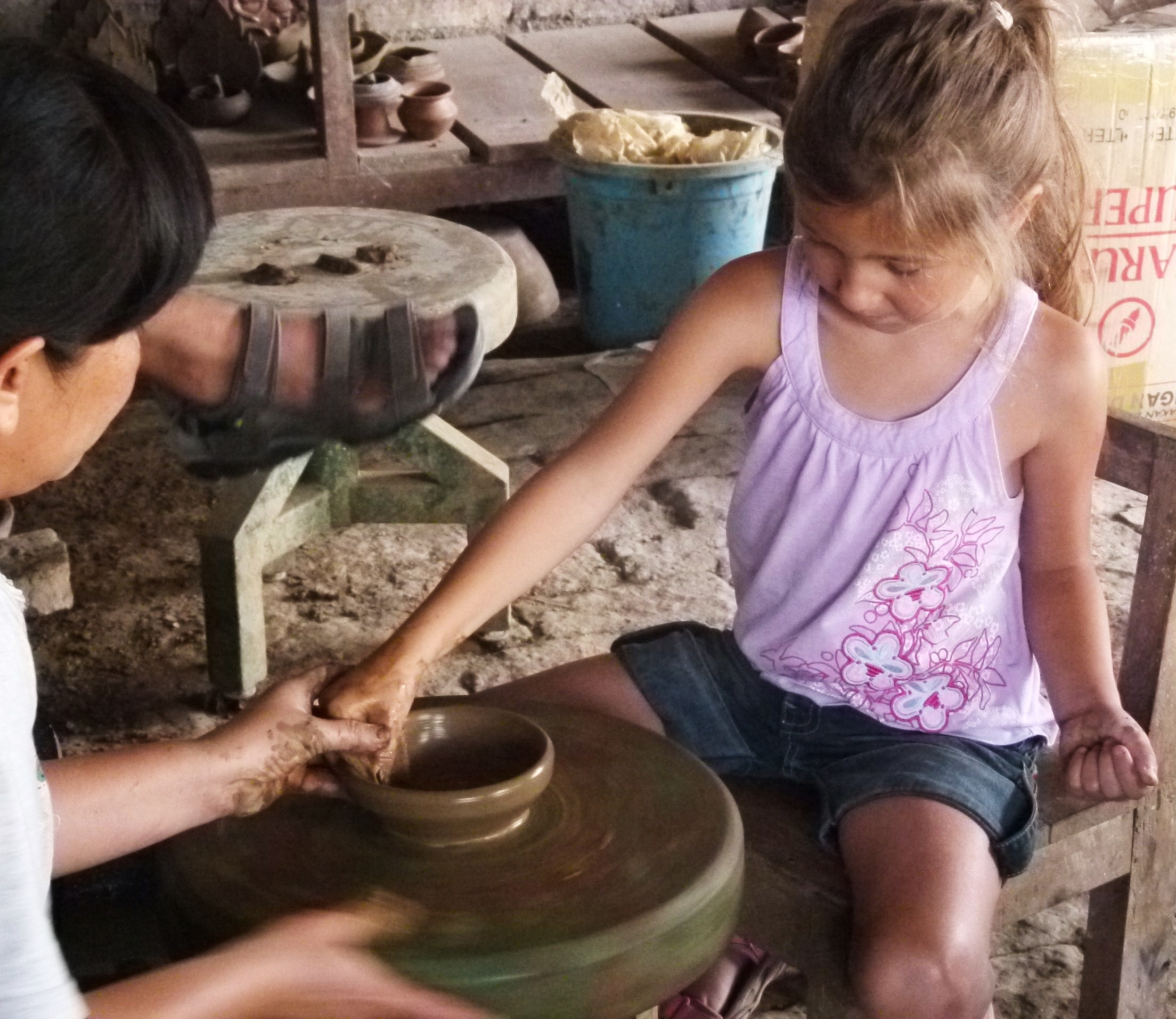 Puis, c’est l’heure de la leçon de poterie dans un autre village d’artisans potiers : les filles s’essaient au tour et sont ravies de leurs créations : je leur propose donc de faire un stage chez Annie-Claude en rentrant et Mady déclare fièrement et rapidement : « moi , je veux être potière quand je serai grande ! »
