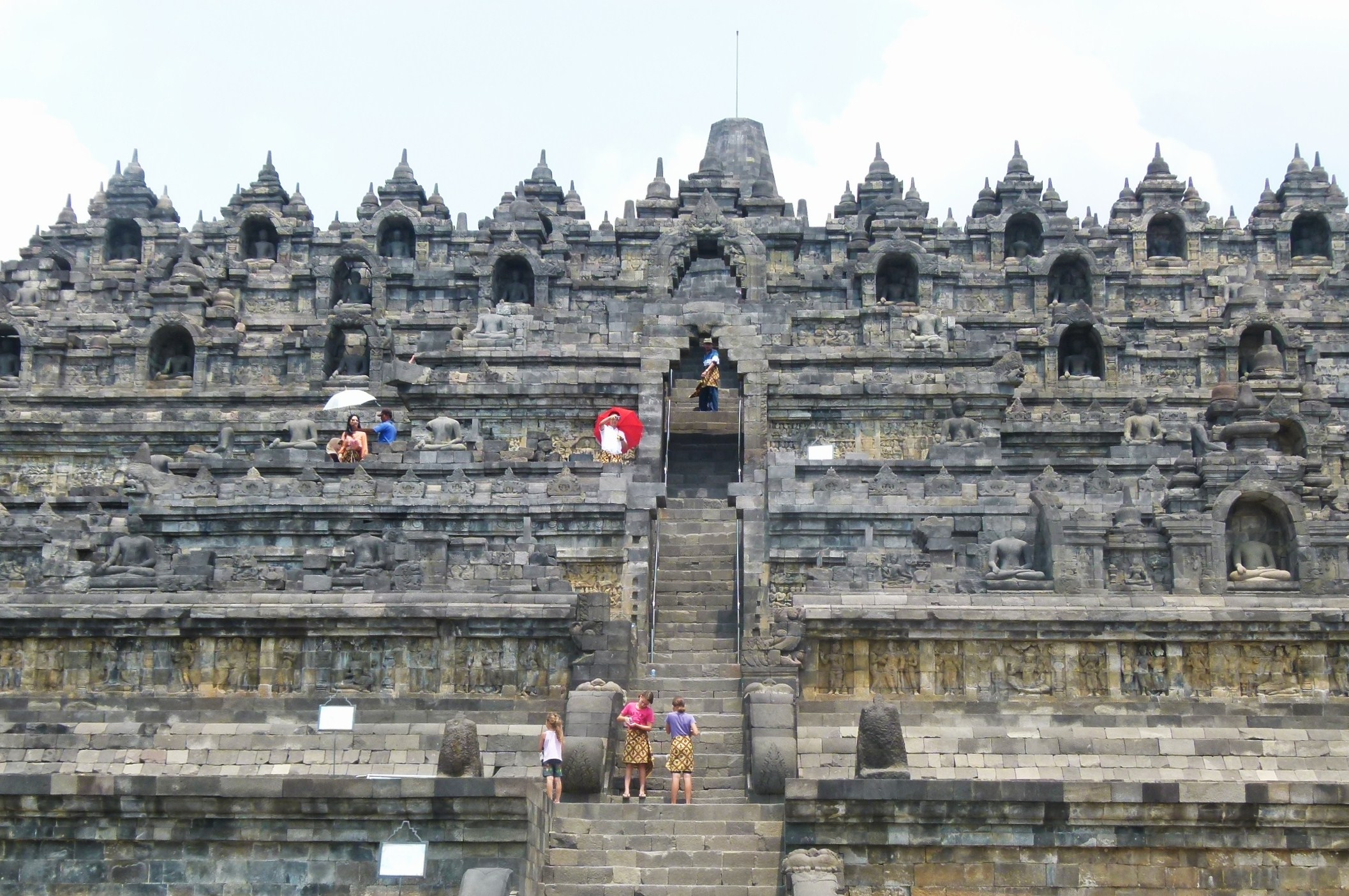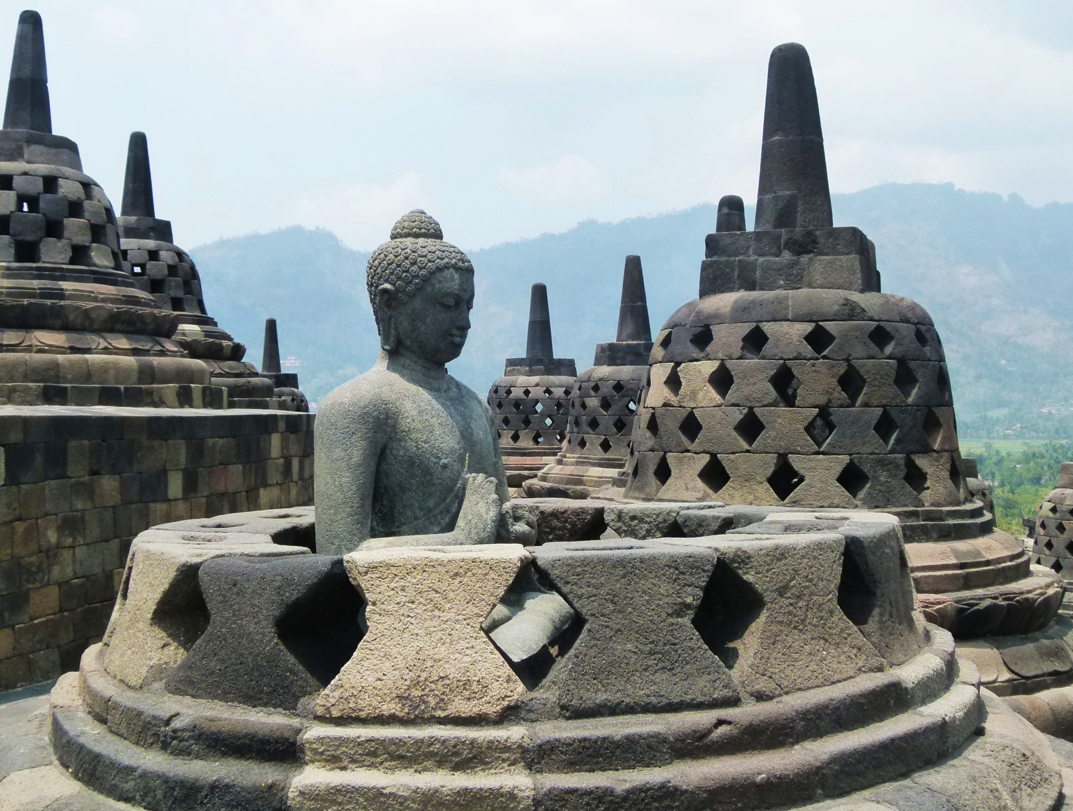 En redescendant dans la plaine, nous traversons les champs de tabac et de piment pour découvrir le majestueux temple de Borobudur. Malgré les éruptions des volcans alentours, les bombes terroristes et les tremblements de terre, Borobudur affiche un très bon état de conservation, en grande partie grâce au soutien de l’Unesco : 9 terrasses, des bouddhas partout, de très belles frises et sur la dernière terrasse figurant le nirvana, des stupas cachant là encore de nombreux bouddhas.