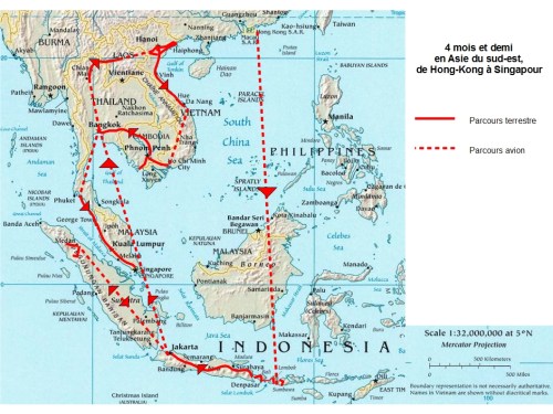 Nous voici donc à Singapour, tout au sud de la péninsule. Singapour sera notre terminus. Nous sommes arrivés en avion par Hong-Kong le 27 août 2011, ce qui fait quatre mois et demi de parcours. Je dessine notre parcours sur une carte :