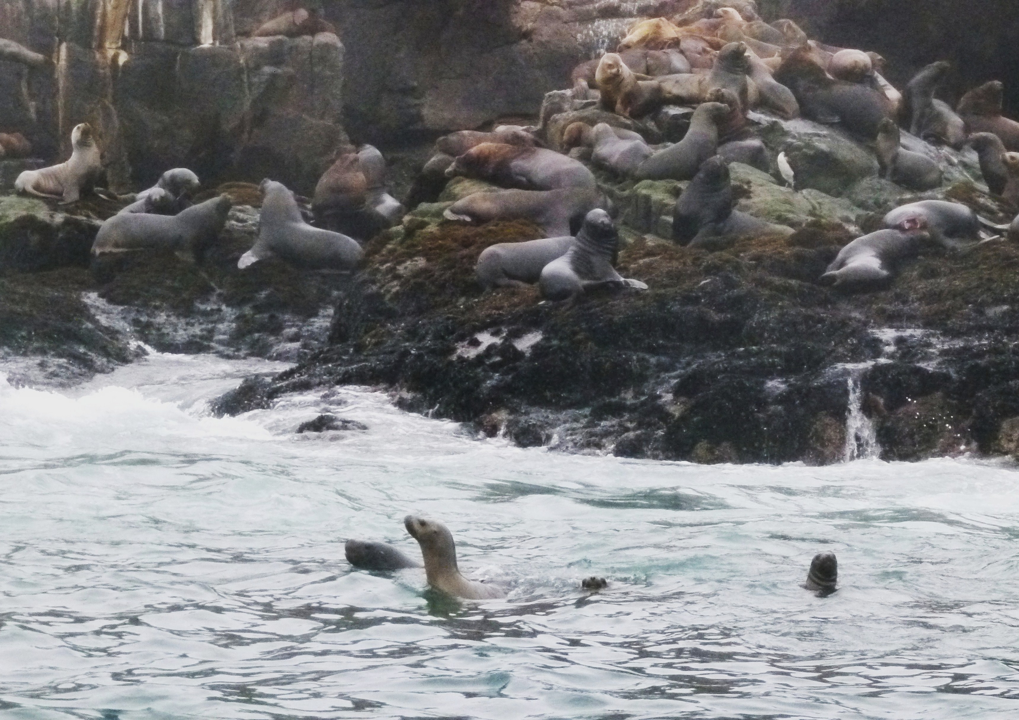 Pour cela, il faut nager dans une eau grise à moins de 20°C, éviter les méduses et gérer la houle qui nous emporte sur les rochers. Nous sommes deux à suivre Kafet, qui lui plongera sans combinaison et sans gilet de sauvetage. Les lions de mer sont agressifs sur l’île, mais dans l’eau du Pacifique, ils sont pacifiques … paraît-il. En fait, ces otaries sont curieuses et elles viennent nous voir dès que nous arrivons dans l’eau. J’ai beau me dire que ces animaux sont mes copains, je ne suis pas complètement à l’aise avec ces mastards de 150 à 300 kgs qui nagent autour de moi, se dressent, plongent d’un côté pour réapparaître d’un autre côté.