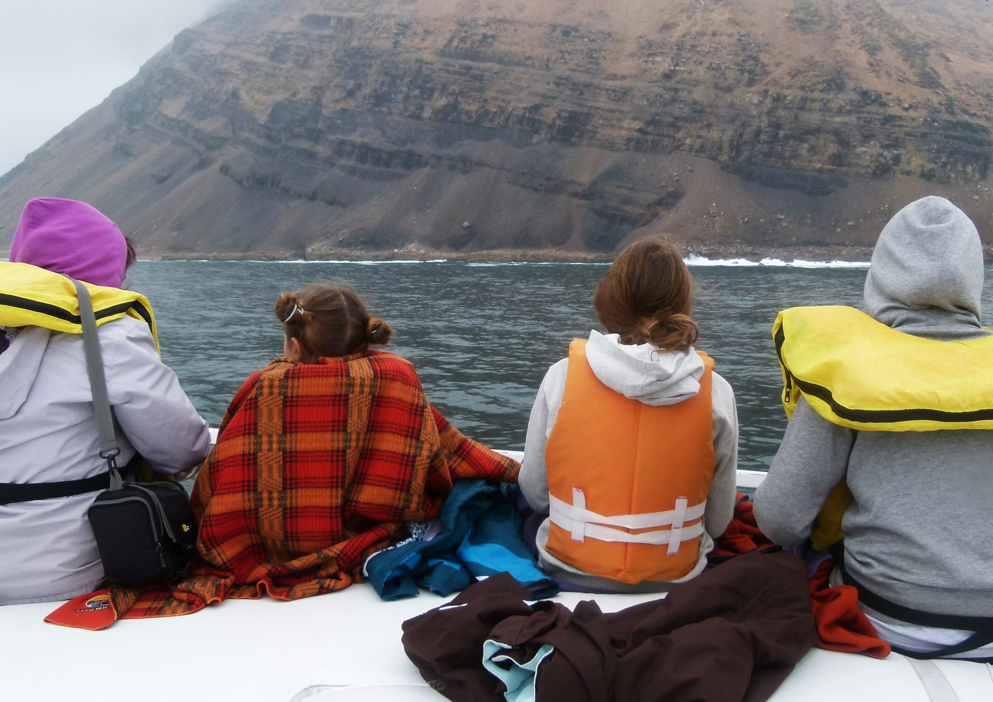 A l’avant du bateau, il ne fait pas froid mais le vent et les embruns nous obligent à nous couvrir (Anne, Jean-Michel, nous avons finalement bien fait de garder encore un peu nos anoraks).
