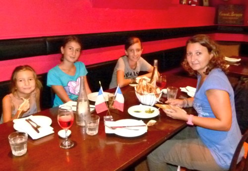 Comme d’habitude, on regarde les vitrines mais on n’achète rien d’autres que des cartes postales et des petits souvenirs pour les copains. Et finalement, c’était enfin l’heure d’aller au restaurant français que j’avais choisi : « La Guillotine ». Les serveurs étaient français, il y avait des escargots sur la carte mais nous avons plutôt choisi de manger des moules, des crêpes, des crumbles, des tartes, du bon pain et pour Papa du vin. C’était bien bon même s’il n’y avait pas de bougies.