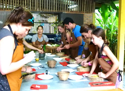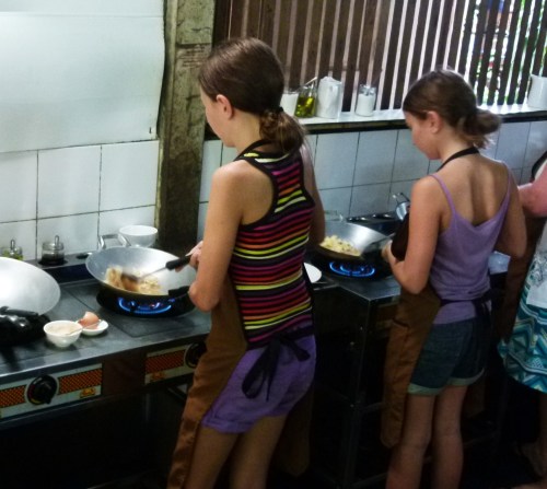 Cléo et moi avons très envie d’aller suivre un cours de cuisine thaï. Finalement, toute la famille se rend à la « Smart cook thaï cookery school » pour une matinée intense : tout commence par la visite du marché local pour découvrir les saveurs des produits couramment utilisés : herbes aromatiques comme la citronelle, différents basilics, la coriandre, des épices comme le turméric, le gingembre frais et des légumes qu’on ne trouve en France que dans les magasins asiatiques.