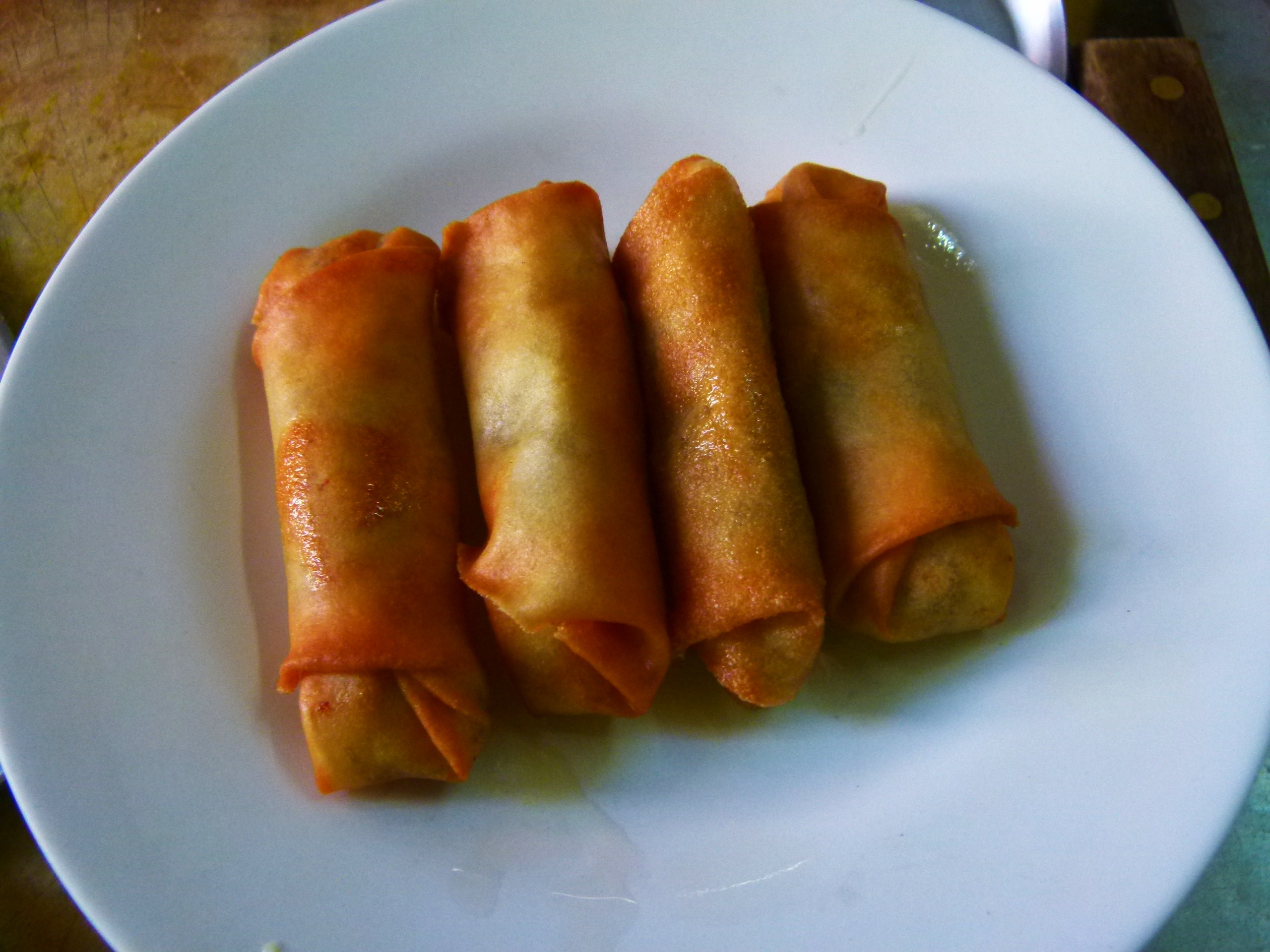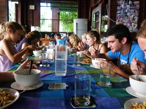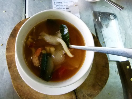 Après quelques heures, vient le temps de la dégustation de nos plats : soupe aux crevettes, soupe de poulet au lait de coco, phat thaï, poulet aux noix de cajou, inévitables nems aux légumes et quelques desserts : bananes au lait de coco, bananes frites et nems à la banane : vous l’aurez compris, vaut mieux aimer ce fruit par ici !