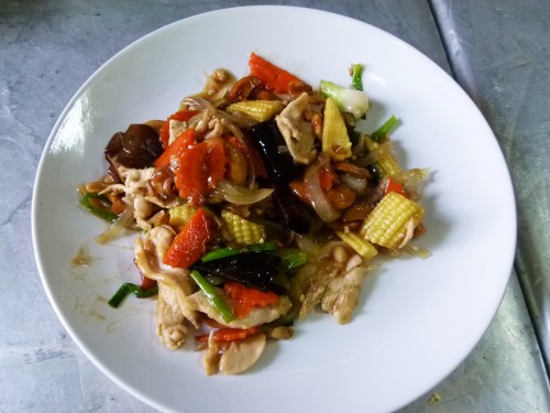 - Ajouter le poulet et le faire cuire (il doit rester blanc, ne pas dorer). Mettre tout ça de côté dans un coin du wok.